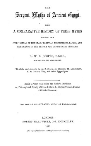 Original Publishing: Cooper, W. R. (William Ricketts). The Serpent Myths of Ancient Egypt Being a Comparative History of these Myths Compiled From the Ritual of the Dead, Egyptian Inscriptions, Papyri, and Monuments in the British and Continental Museums . London: Hardwicke, 1873.